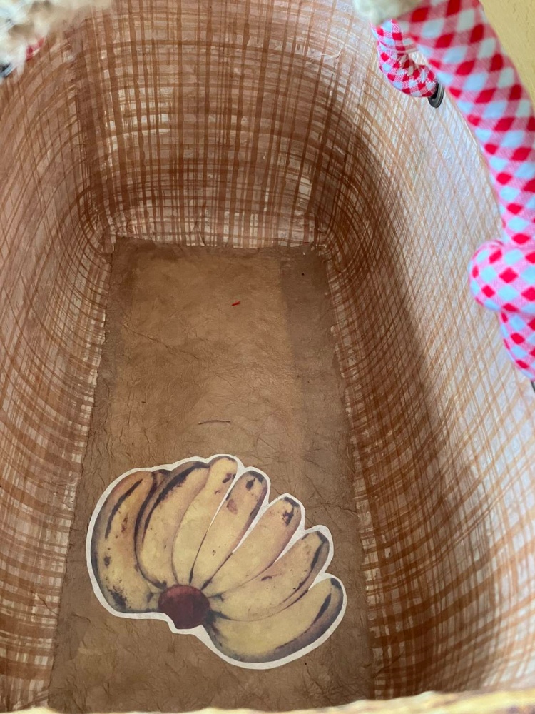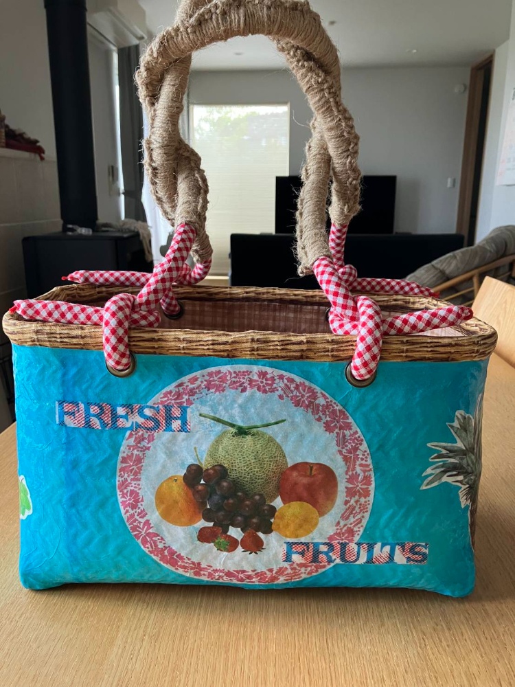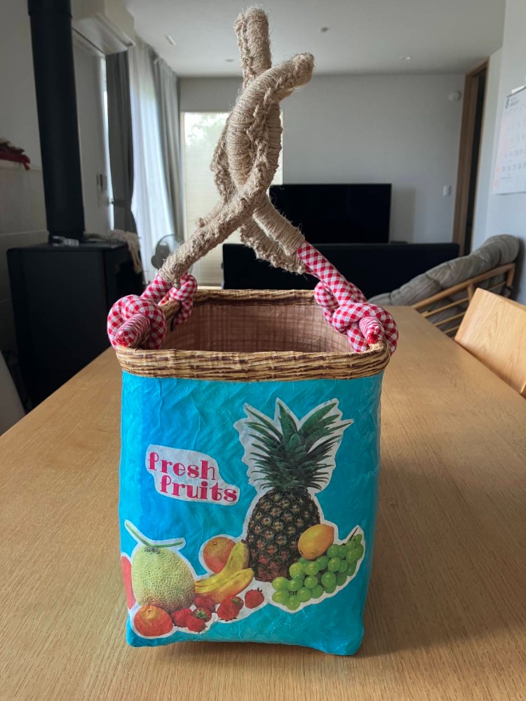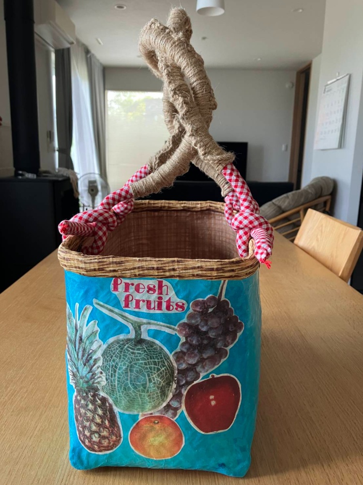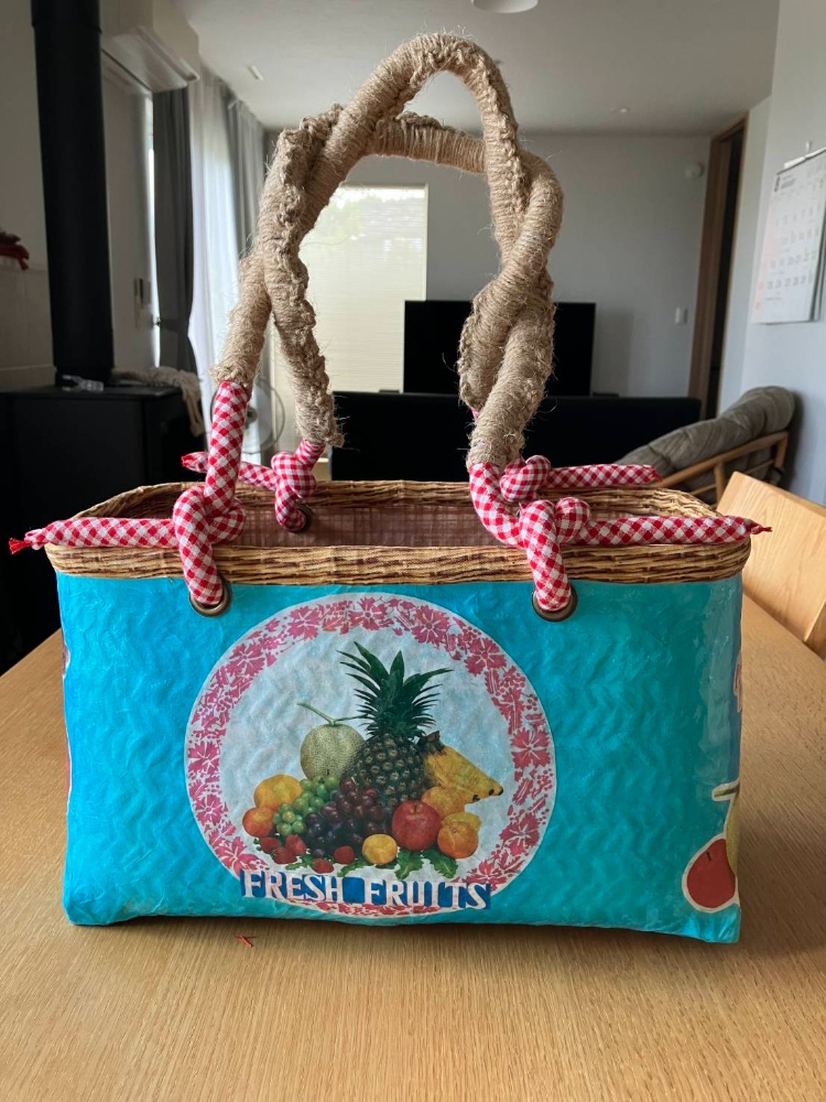 縁に張ってあるのは生地。内側は和紙だそうです。よくこれだけの素材が揃いましたね❗本当に籠みたいですよ。初めてハトメにもチャレンジされて、これで重い果物にも耐えられます😁持ち手は赤を入れたかったけど、甘くなりすぎないように麻紐を編みつけたそうです👌