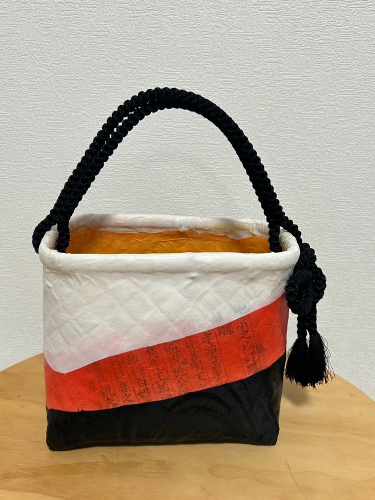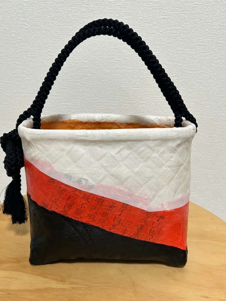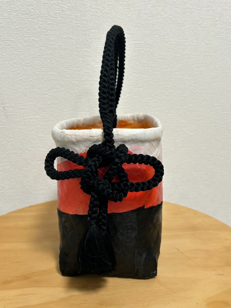 【生徒さんの作品】持ち手の穴は両サイドにひとつずつ。黒色の帯締めをサイドで結んだのが大人可愛い感じです。白い部分は長襦袢だそうですが、張りづらかったようです😅白色って難しいと思ってしまう私です💦赤色和紙の下には文字が張られています。なかなか斬新で印象的なデザインですね👍明日の準備をしていたら、ブログ更新が遅くなってしまいました。うちの出店は明日のみ。屋外テントでのワークショップです。雨降りませんように🙏