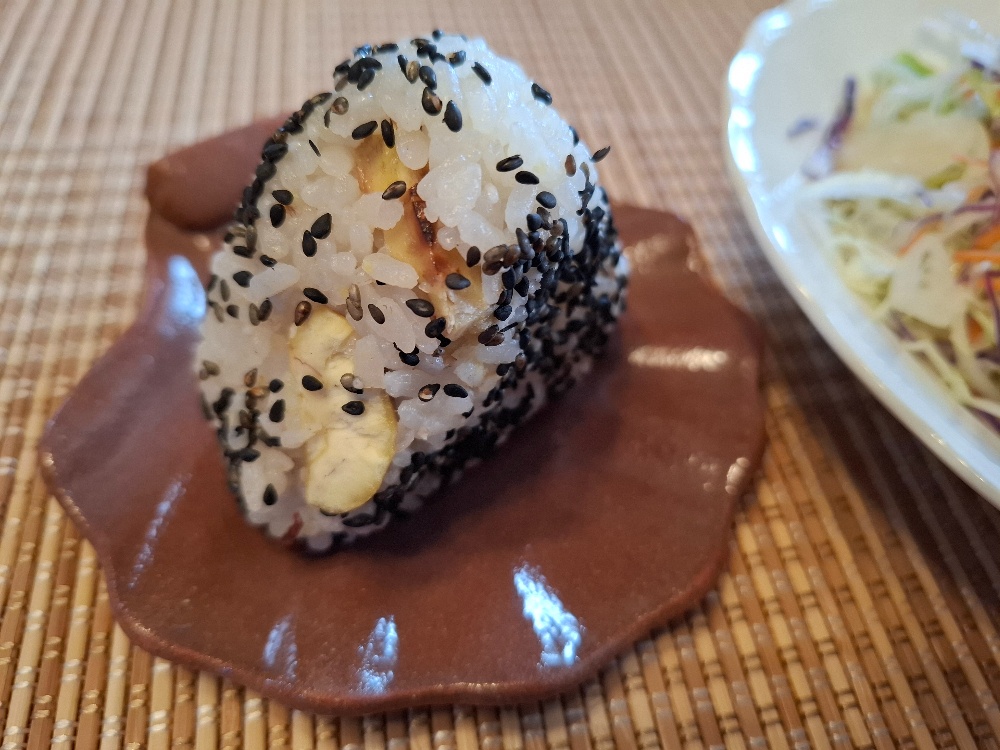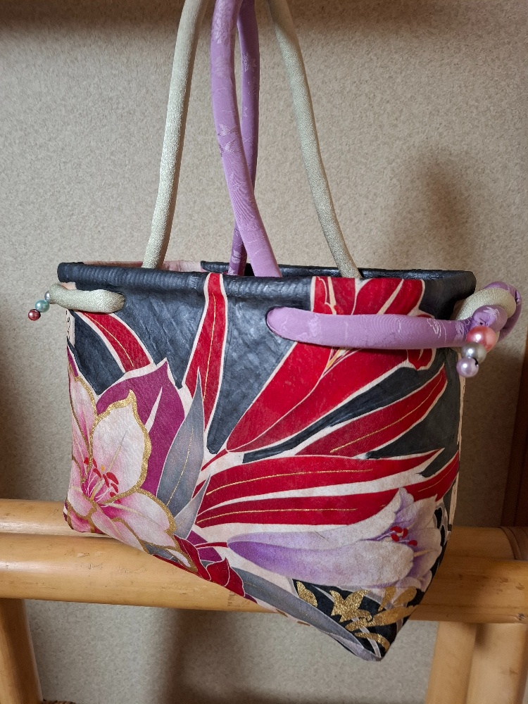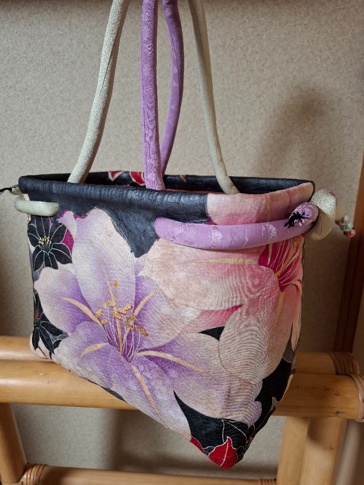 【ひろこの作品】とても派手なユリの柄。これも着物だったなんて、凄くないですか?😲背景は黒い和紙と、滅多に使わない私が書いた反古紙です。生徒さんのためには書いても、自分では使わないんですよね😅籠は少し大きめです。小さな籠にも合わせてみたのですが、流石にこのユリの迫力には負けてしまってー。派手と言うか、艶やかなかごバッグになりました✨おにぎりアクション6日目🍙一度は作りたい栗ご飯の🍙です。朝から🌰を剥いてお昼ご飯に🍙😋今秋2回目の🌰ご飯。美味しくできました😄
