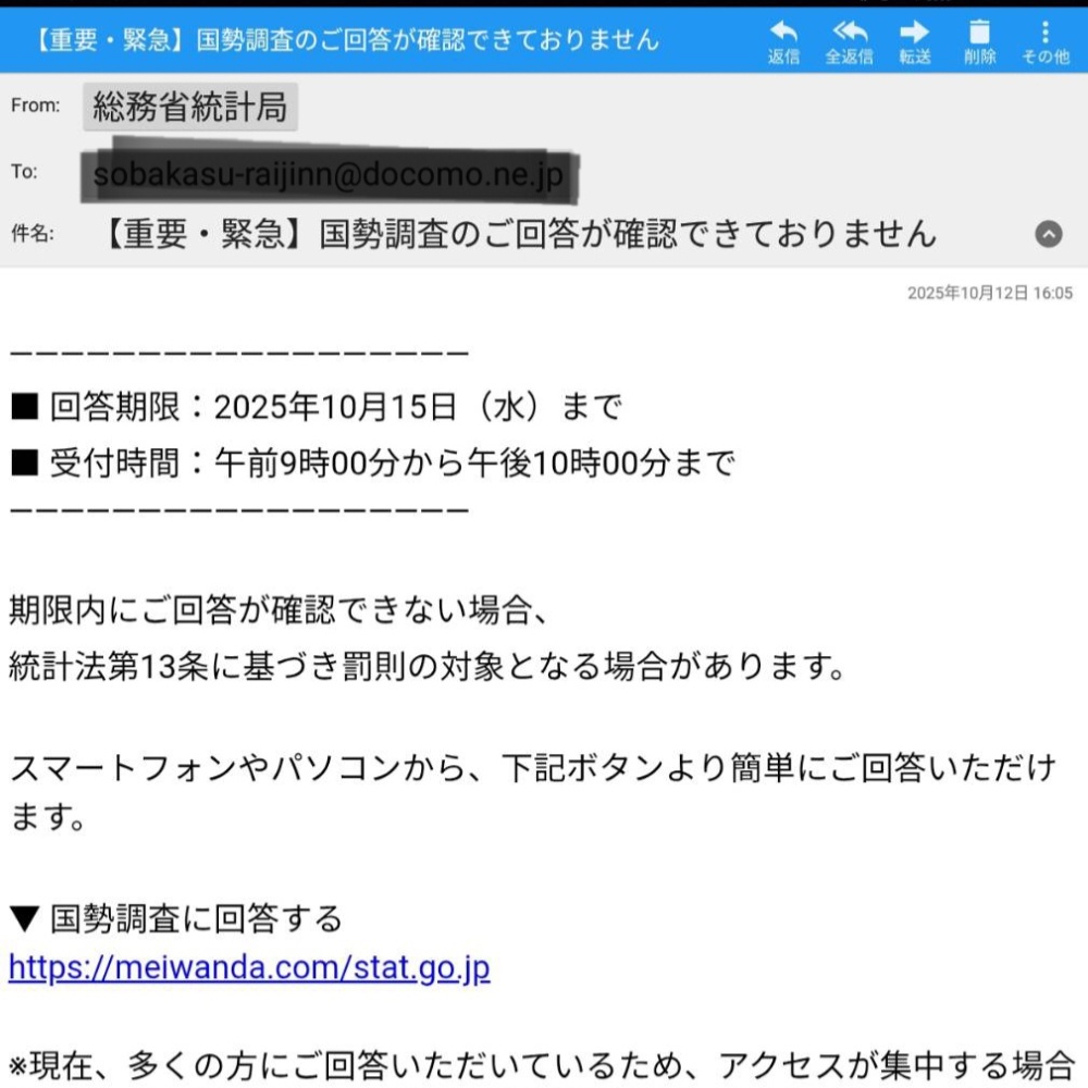 この連休を狙った悪質な詐欺メールです。連絡しようにも市役所は休みだし、終わってないなら休み中に終わらせたいのは皆さん同じでしょう。今回の国勢調査はネットでの回答を推奨していますから、ネットに慣れない方もチャレンジなさったかも知れません。こんな卑劣なメールに騙されないで⚠️不安な方は私のように確認してみてください。