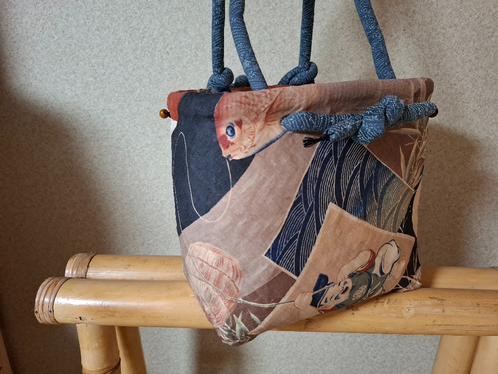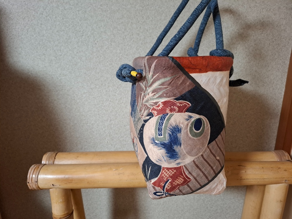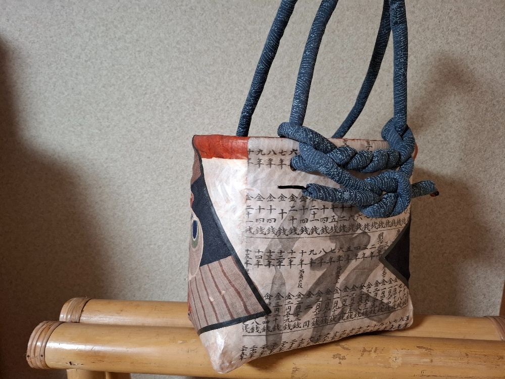 鯛を釣り上げた恵比寿様。勢い余って引っくり返ってしまいました😆少し小さめの籠に張ったので、籠の高さが足りなくて、真っ直ぐに張ってあげられなかったんです😅裏面には俵という字が見えますか?年代別のお米の値段が記されています。