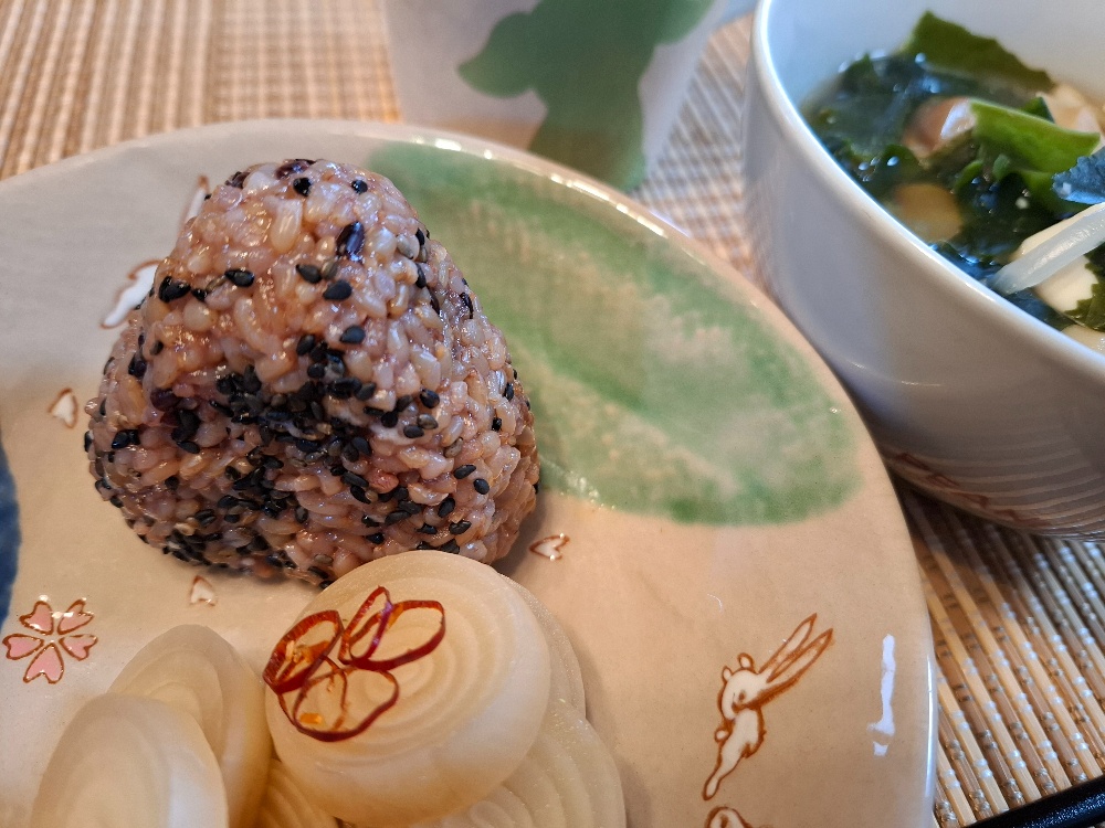 おにぎりアクション9日目🍙黒米玄米の🍙に胡麻塩。小さな玉葱を丸ごと甘酢で漬けたものと、具だくさんのお味噌汁。ご馳走はないけれど、こういう素朴な食事が贅沢な気がします😊