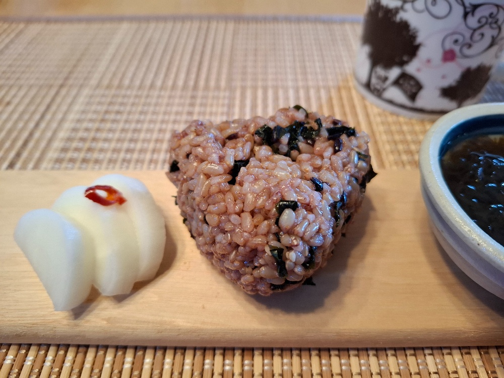 おにぎりアクション11日目🍙いつもの玄米にわかめご飯の素を混ぜました🍙もずく酢と大根の漬物と。