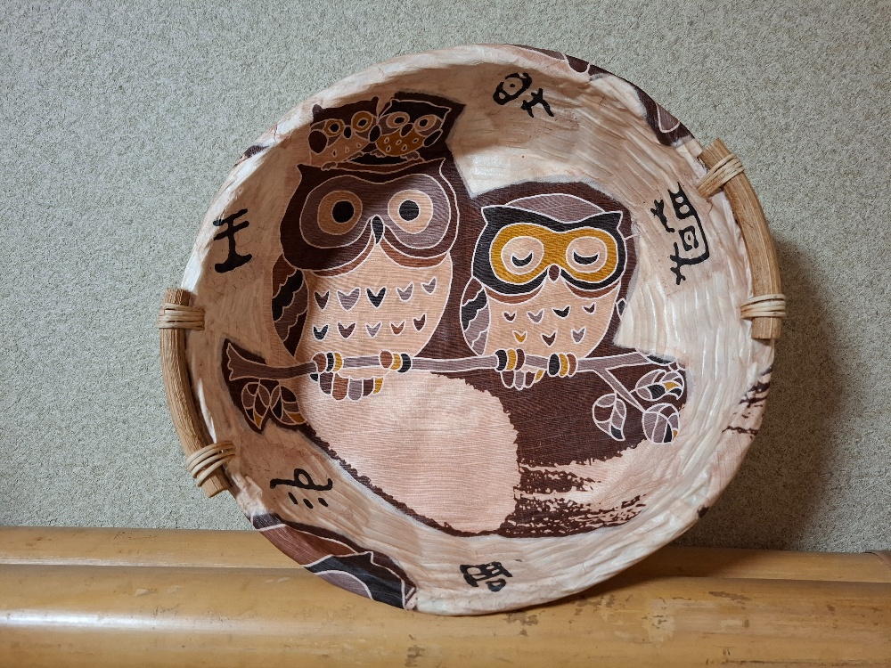 遊びに来てくれた友だちが写真のざるを気に入ってくれてお買い上げ。恐らく最後になるであろうこの形を何処に出そうかと迷っていたのですが…そこに落ち着きましたか😊人気があった形だし縁起物の🦉だし。結果良かったです👌