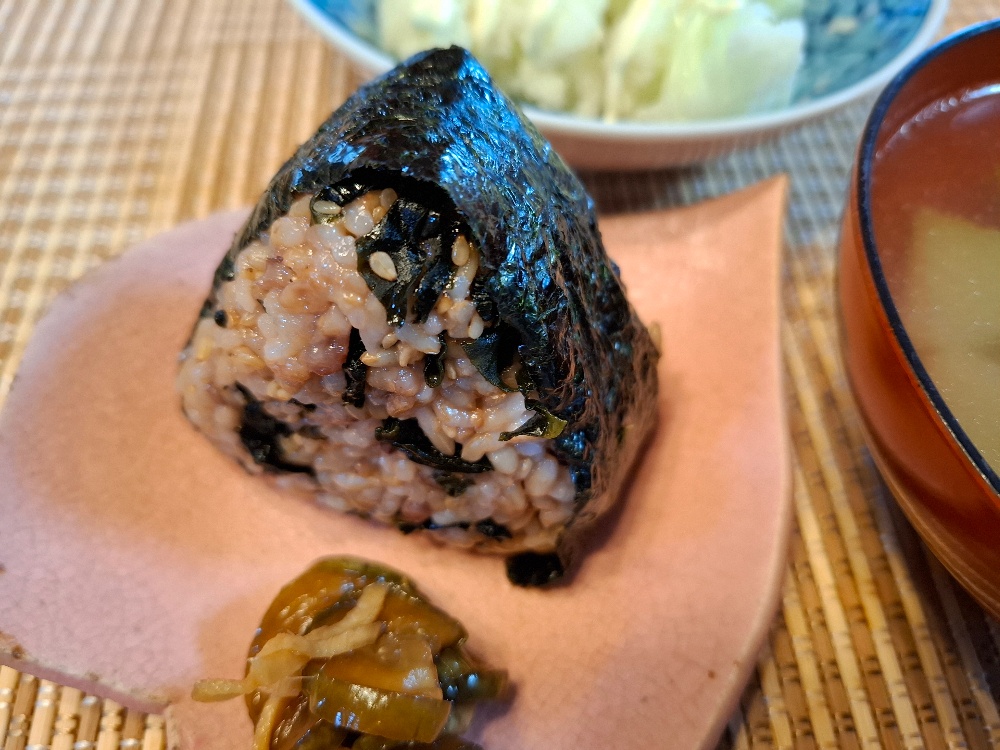 おにぎりアクション15日目🍙玄米にワカメふりかけを混ぜた🍙手作りのキュウリの佃煮を添えて😊よく噛んでいただきましょう😋温かい汁物が美味しく感じる季節ですね🍜