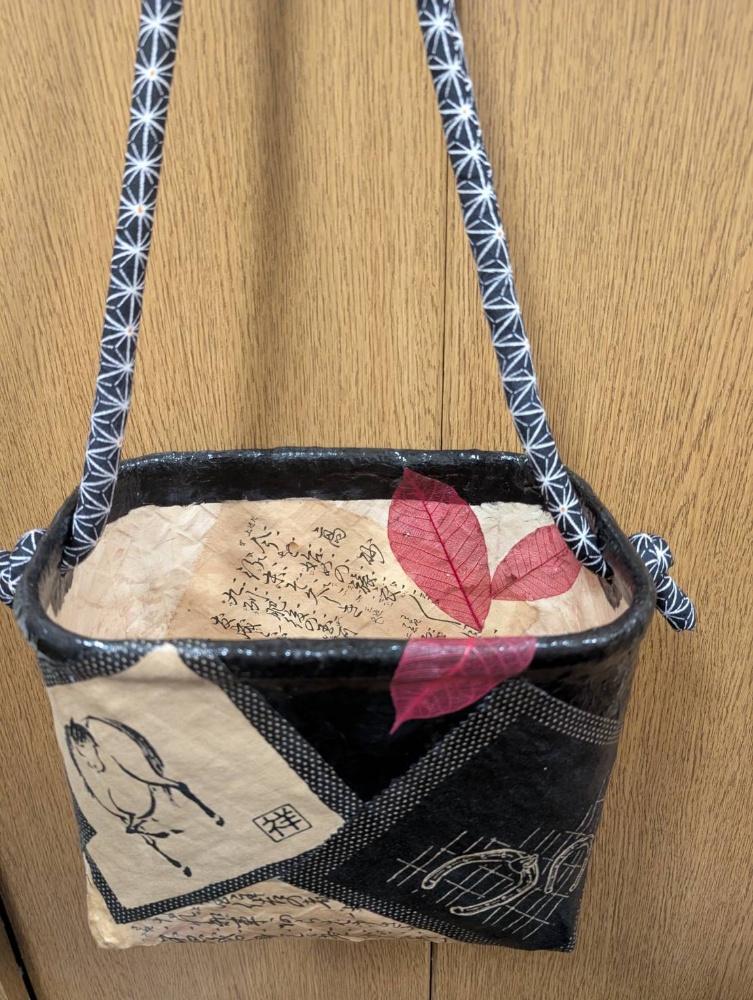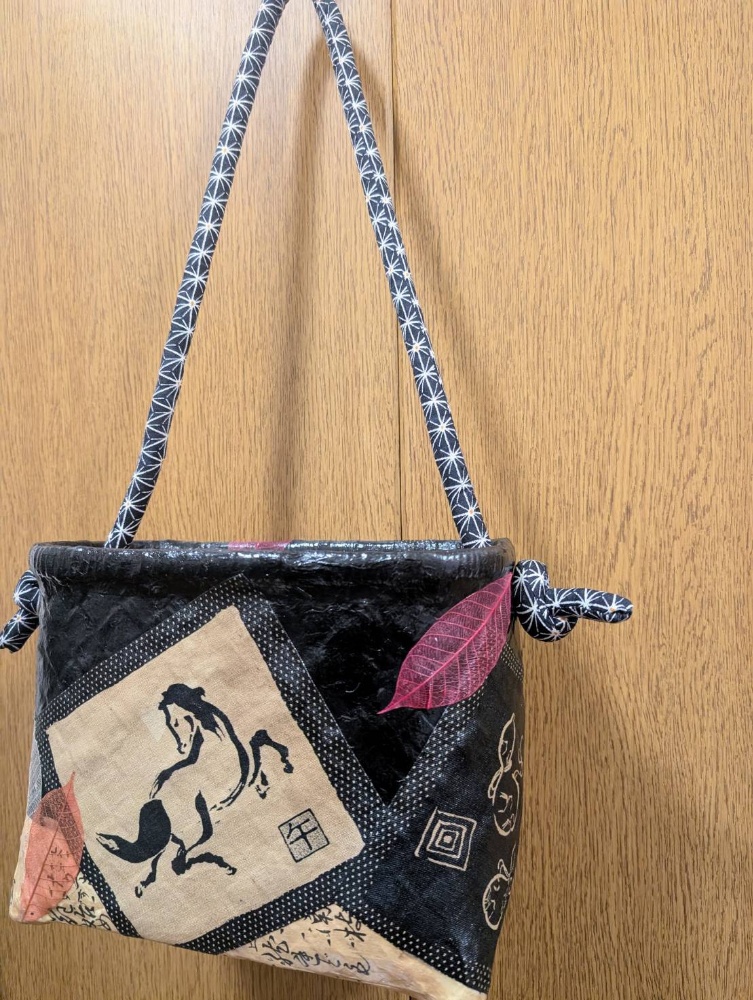 【生徒さんの作品】一足お先に馬のかごバッグを作った生徒さんが写真を送ってくれました。馬の柄ってなかなか無いんです。素敵な生地に出会えて良かったですね🐴干支柄は人気のひとつです。黒地ですがシックになりすぎず、彩りの葉っぱがとても活きていますよね。ショルダーバッグに仕立てたようです。素敵に仕上がりました✨おにぎりアクション17日目🍙刻んだ甘酢生姜と黒ごまを混ぜた🍙に味付け油揚げをくるみました。稲荷握り🍙です。