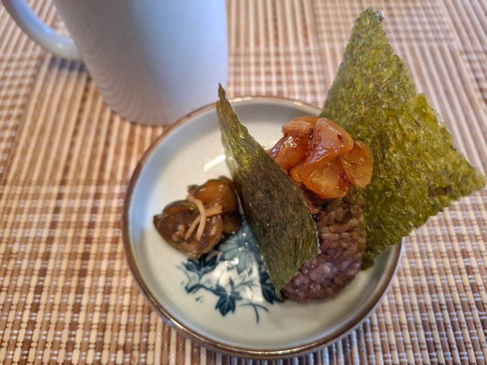 おにぎりアクション32日目🍙黒米玄米の🍙に生姜の佃煮を乗せました。佃煮って本当にご飯に合いますよね。キュウリの佃煮もご一緒に。美味しくいただきました😋