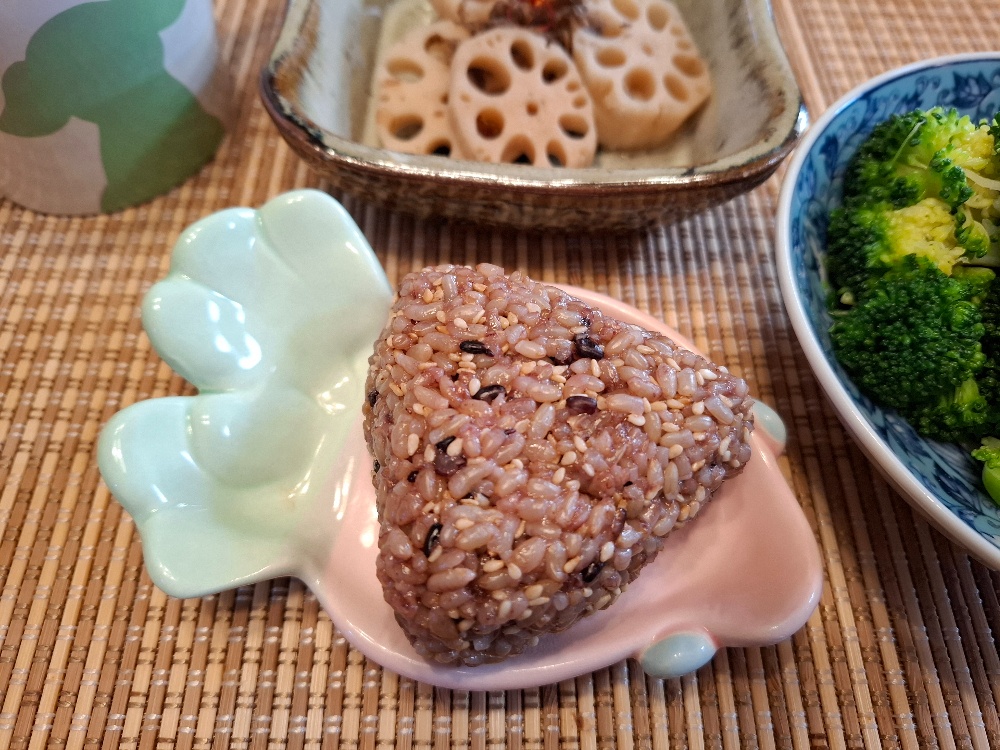 おにぎりアクションFOR JAPAN7日目🍙今朝は蓮根とごまが食べたくなって、冷凍庫をゴソゴソ。蓮根を煮物にしました。黒米玄米に白ごまをたっぷり混ぜて🍙に。身体に足りていない物を食べたくなるのでしょうね。朝からみたされました🈵️
