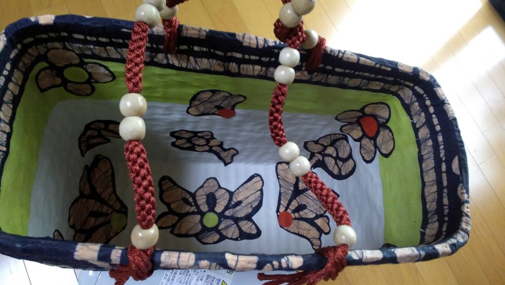 ベテランの生徒さんの作品です。お友だちからの依頼で張ったかごバッグ。一閑張りをやったことのないお友だちが選んできた材料を預かって作ったものなのですが、正直なところそれって大変です😅張りにくい材料でも関係なく、見た目だけで用意しちゃうから。それでもNOとは言わずに預かって、見事に仕上げましたね。