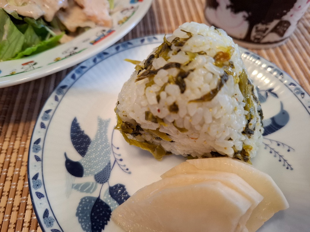 おにぎりアクションFOR JAPAN11日目🍙高菜明太を混ぜました。添えたのは初めて作った「大根の味噌ヨーグルト漬け」です。うん😊美味しくできました👌