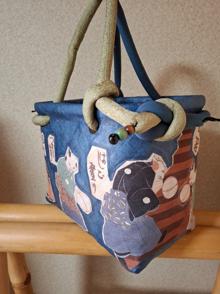 【ひろこの作品】歌川国芳の「流行猫の曲手まり」かごバッグ、仕上がりました✊明日はマルシェ。荷物の準備をしていたら遅くなってしまいましたね😅うちのマルシェスタートは笠間工芸の丘で開催された【COLORFUL】でした。何も判らなくて不安だったけど、主催者さんを紹介してもらって出店しました。その後何度も出店させていただいて、明日もその【COLORFUL】です。雨の心配は無さそうですね。楽しく過ごせますように🙏