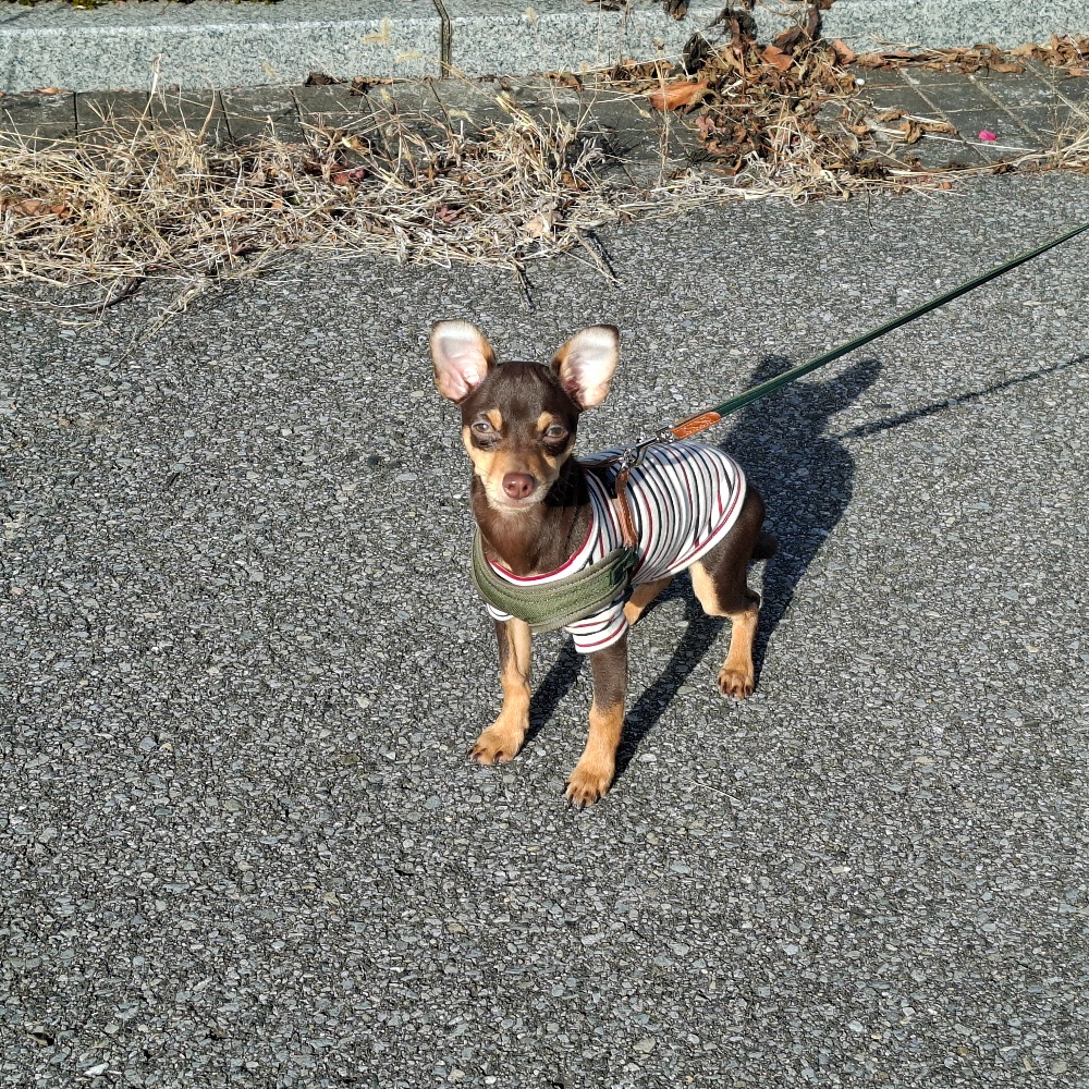 我が家のチワピン♂️4ヶ月のAzuki。一昨日お散歩デビューしたのに昨日は雨。今日が2回目のお散歩です。未だトイレトレーニング中でもあり、上手くできるとご褒美がもらえるので、随分上手になりました。