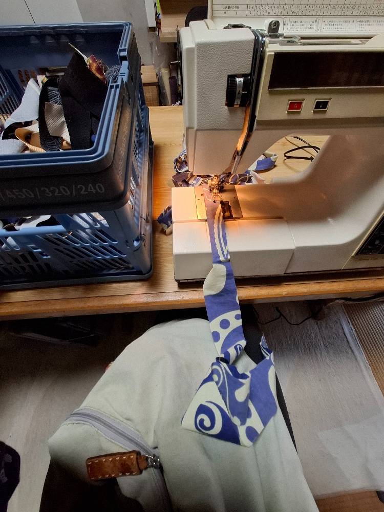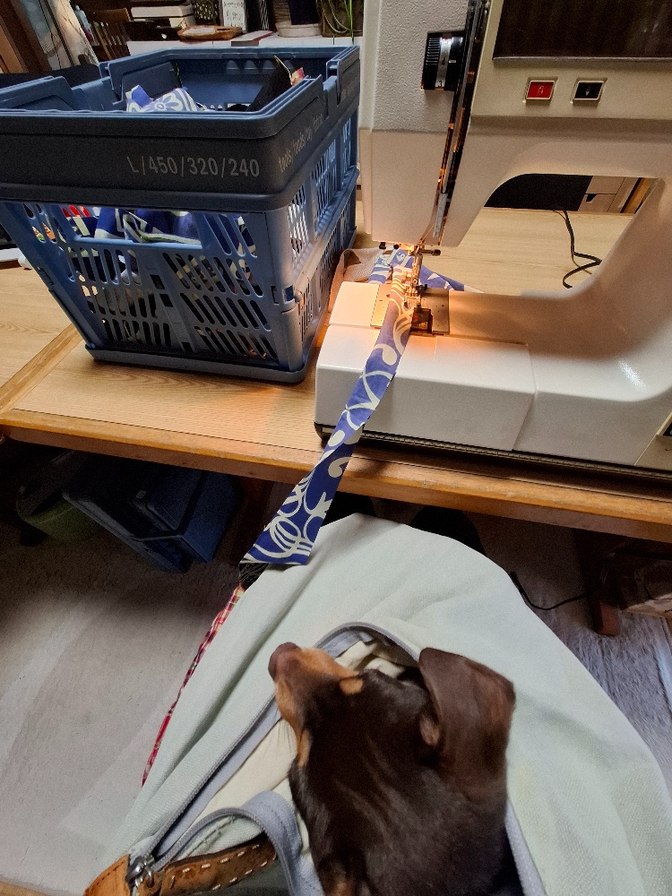 結構な数の持ち手用布がカットできて、午後から漸くミシン掛け…の筈が、こんな時に限って…いや、常になのですが…キュンキュン甘えん坊のAzukiくん🦮昼寝していてもらおうと思ってしっかり散歩してきたのに、1時間で起きちゃって😔私の身体はひとつなのよ。さてどうする?で、やってみました✊スリング代わりの古い肩掛けバッグにAzukiを入れてトントントントン👋寝た😁✌そう、膝上のバッグの中で寝ています🦮温かいです😊2.7kgのAzukiカイロ😆甘いですね~😆