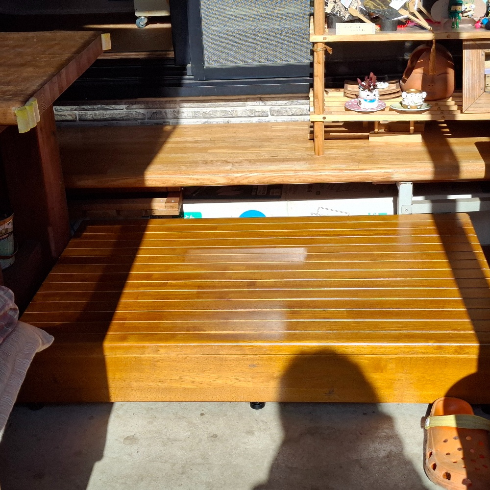生徒さんやお客様の年齢的に、膝や股関節に痛みのある方も少なからずいらっしゃいます。元々の和室にサンルームを足しただけですから、出入口も狭くて段差があって…😥上がり口も今までの簀(すのこ)よりも安定したものがいいとは思いつつ…。