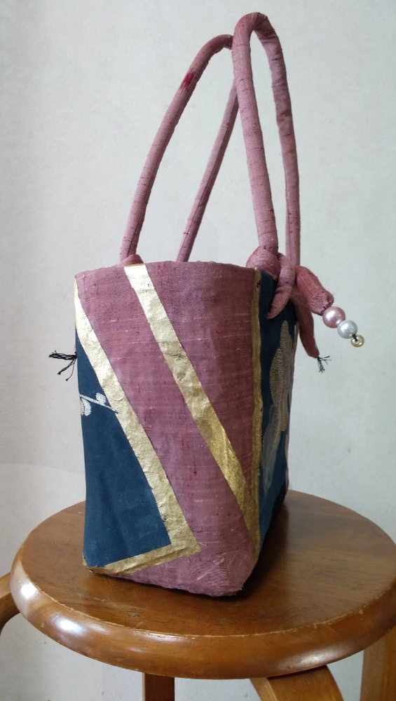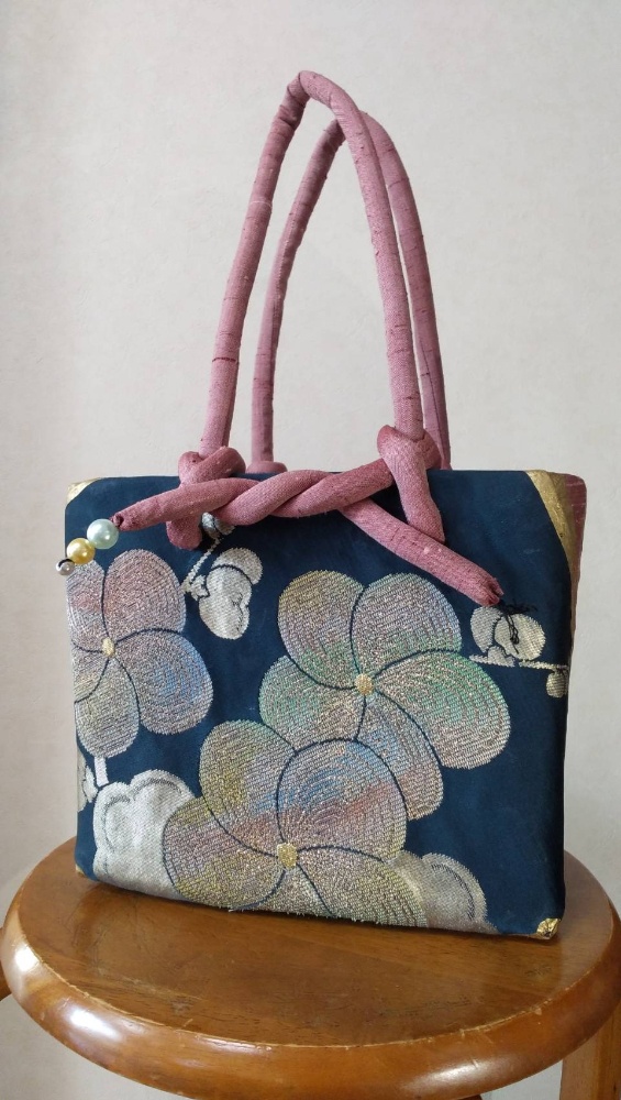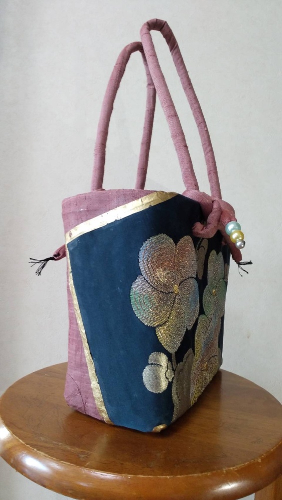 紺地に渋い金糸の梅の花の帯とピンク色の着物、金色の和紙を張ったかごバッグです。持ち手も共布で作りました。落ち着いて品のあるかごバッグになりましたね👍