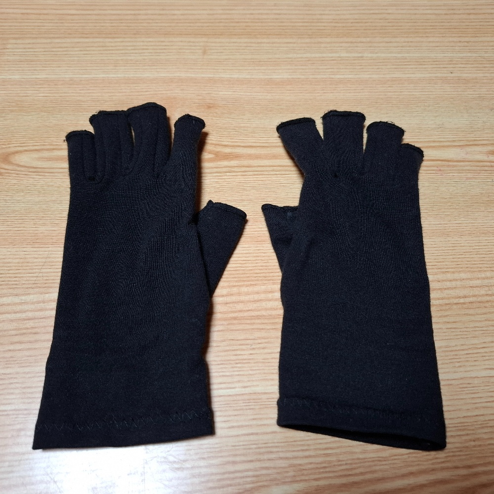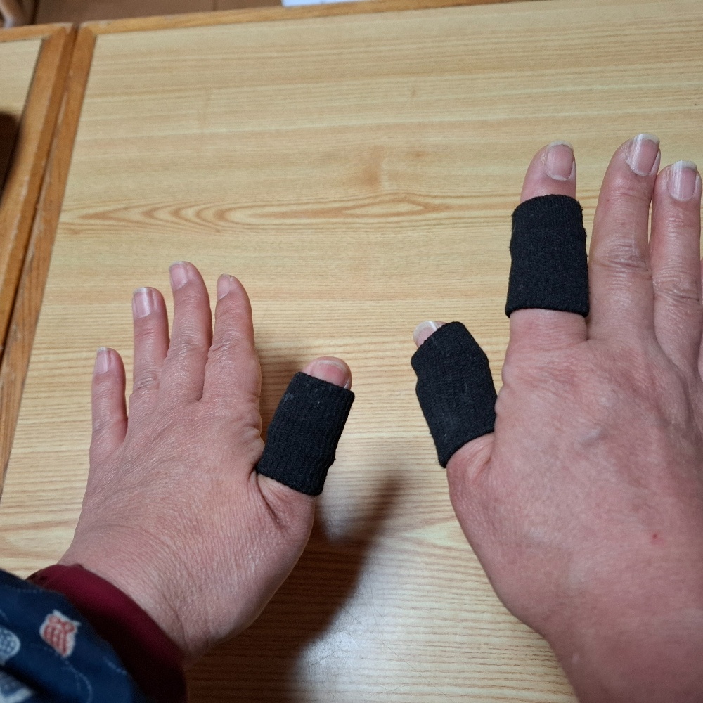 しっかりしたサポーターを着けていると楽なのですが動かせません。普段は2枚目の写真のようなサポーターを着けているのですが、作業にはむきません。更に最近は「高市みたい」と言われるので凄くイヤです💢😫それで指の関節だけサポートできるような物を着けています。それだけでも楽なんです😊