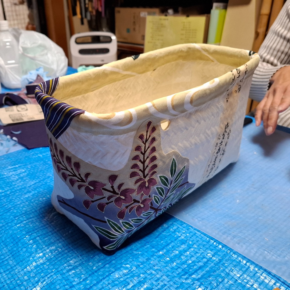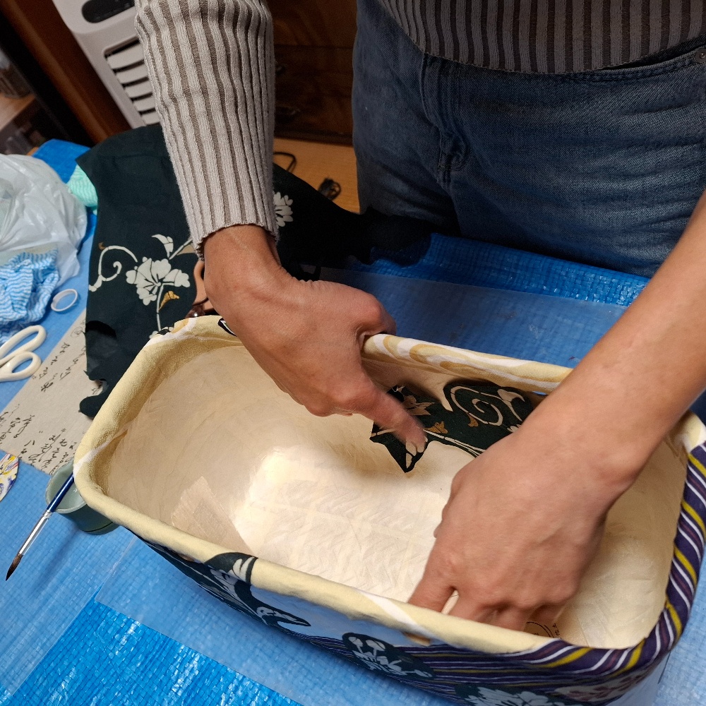 一閑張り教室ひろこさん家。今日は生徒さんがデザイン張りの日。初めての一閑張り🔰下張りでは紙だけなので今日は初めて布を張る生徒さん🔰一方の私は自分で散々張ってきたし、大勢の生徒さんたちにも教えてきています。回を重ねるとぶれてくるところもあるかも知れません。だから初めての生徒さんに向き合う時はこちらも改めて初めてのつもりです🔰真剣に集中して今日は約5時間。頑張りましたね✊お疲れさまでした😄