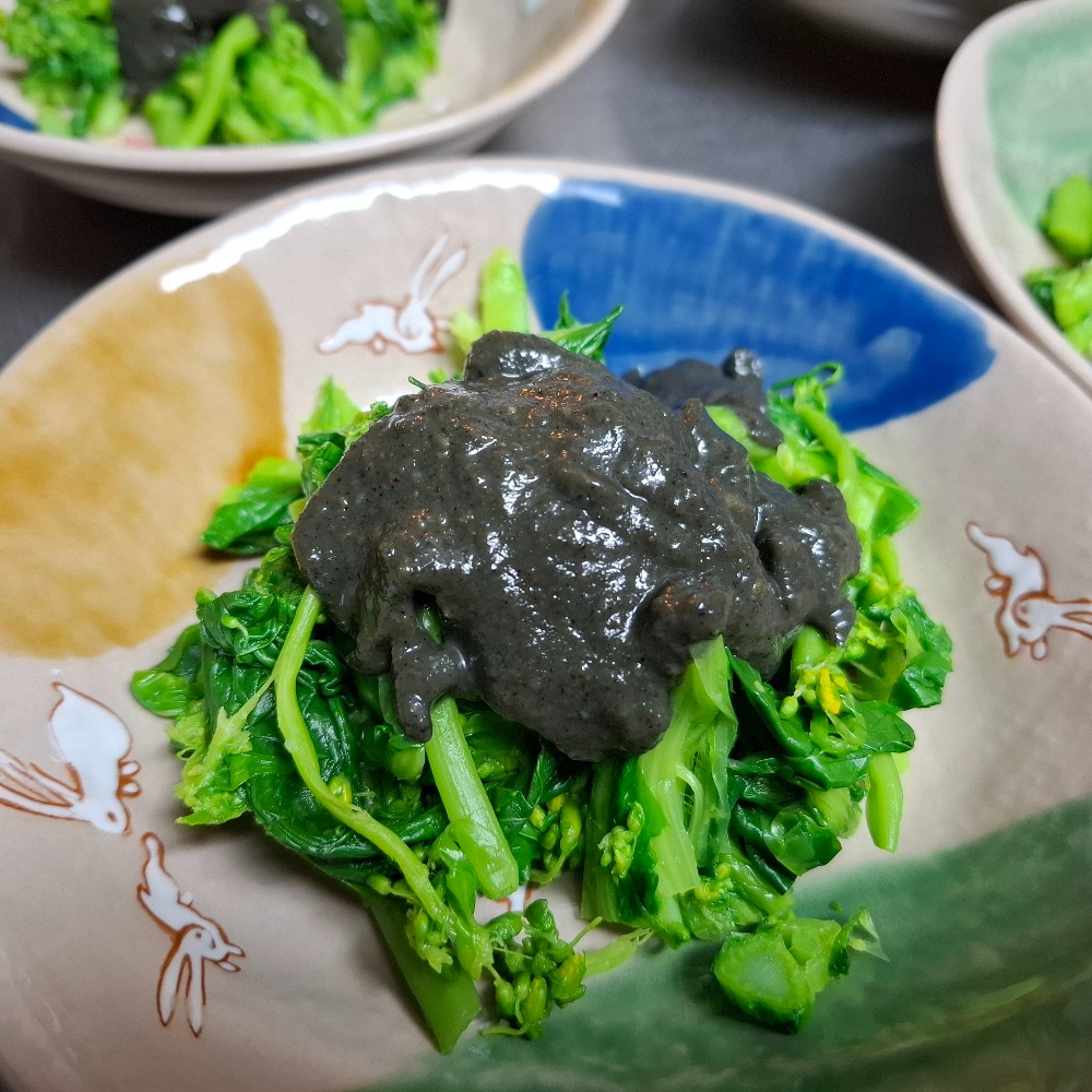 昨日の朝「黒ごまきな粉麹」ができ上がりました。これはパンにつけたり、豆乳に入れたり、ヨーグルトにちょい足ししたり…と思っていましたが、ん💡いけるかも🤩と、醤油と蜂蜜を足して茹でた菜の花に掛けてみました✌️朝摘みの菜の花をいただけたんです😄混ぜちゃうと真っ黒になっちゃうから掛けました。もちろん美味しかったですよ😁