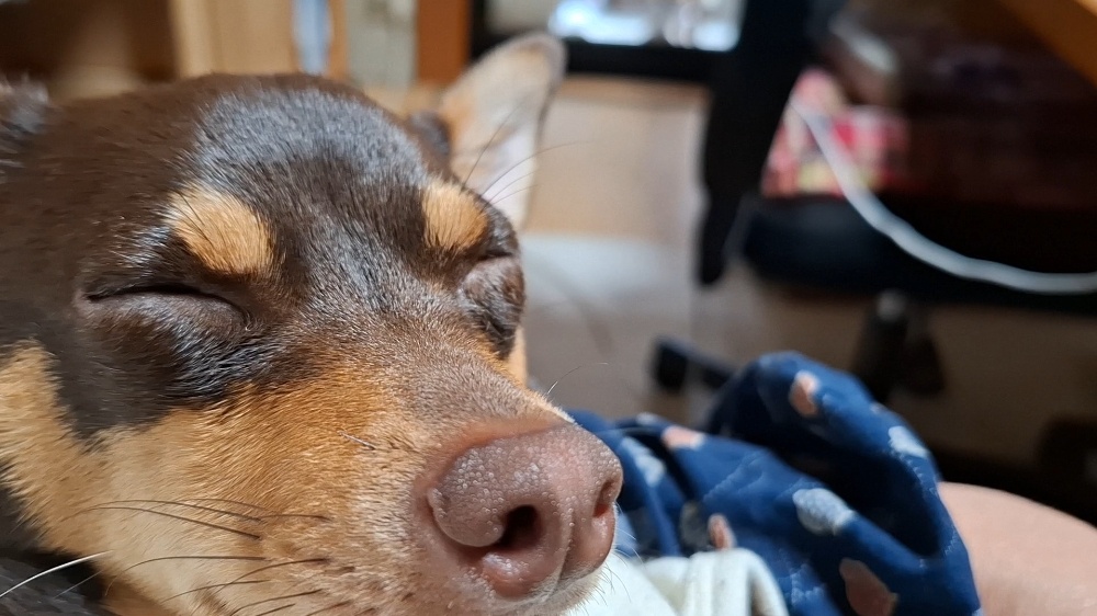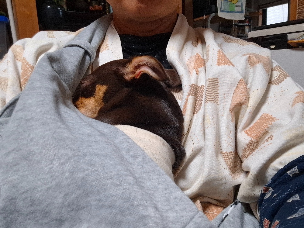 さて、今日のAzukiは午前中お散歩時間がずれたせいかちょっと落ち着かず、ソワソワウロウロ私の周りで動いていました。私も作業しづらいのでYouTubeで「愛犬が落ち着く音楽」なるものを見つけて掛けたところ、早速抱っこ~とやって来ました🐕スリングに入れて抱っこしたらすんなり寝ちゃったんです💤