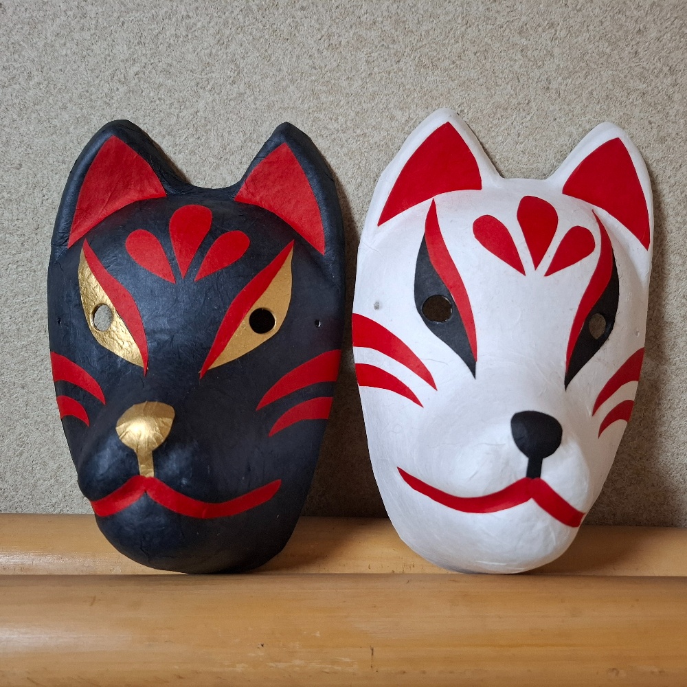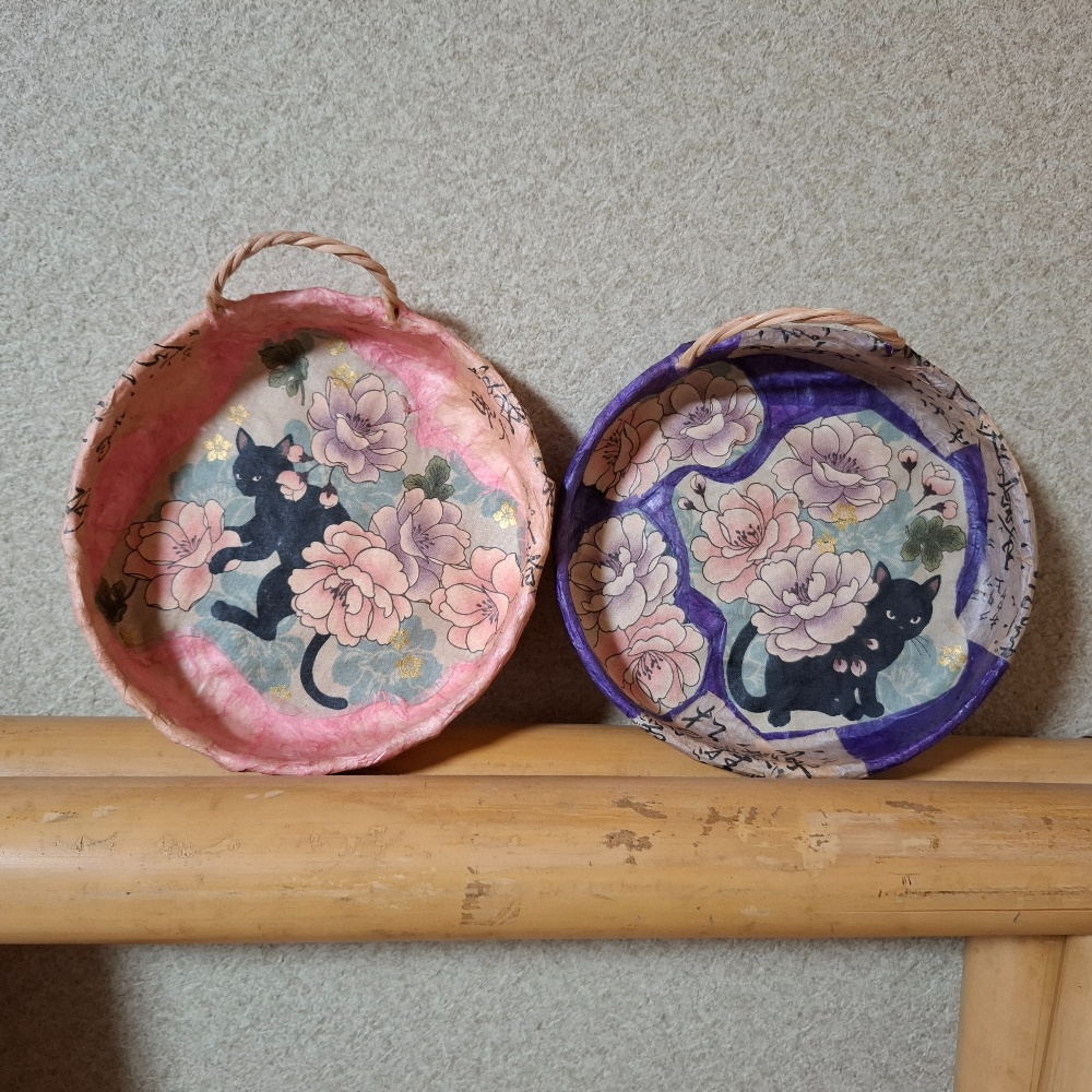 一閑張りは手付きの小さな丸いざる。お馴染みの🐈⬛さん。狐面もできました👍
