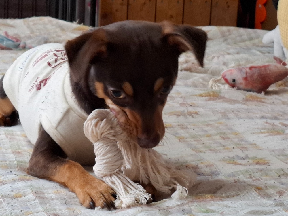 マクラメ編みが、長かったのでシッポを切りました。結わえてAzukiにあげたら夢中で遊んでいます。昨日留守番してくれたご褒美ですね🐕