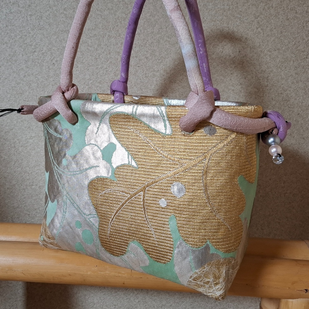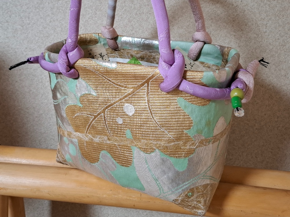 【生徒さんの作品】生徒さんのかごバッグが仕上がりました。張り始めた頃は寒かったけれど、仕上げの今日は暖かい日になりました。私の手元にあった帯をお譲りして。初夏に似合う爽やかなかごバッグになりましたね。金銀入っていますが、どちらも派手でなく上品です。「お祝い事にも持って行けそう」と喜んでいらっしゃいました。お疲れさまでした。