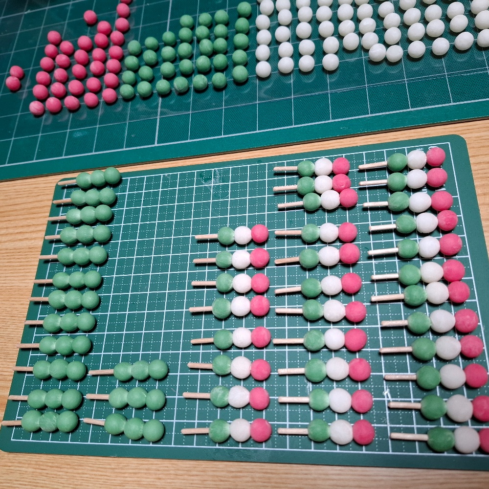 いつも纏めて作る粘土細工の和菓子。そろそろまた在庫が乏しくなってきて、留守番組が無い物多数😅取り敢えず緊急で作らなければならないのは団子たち。昨日の午後から丸め始めました。